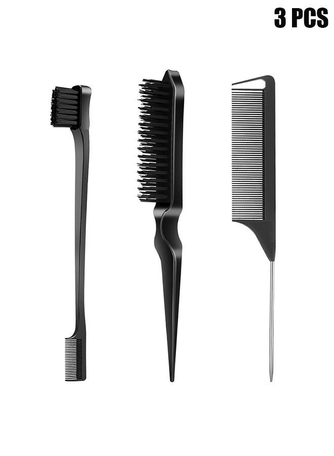 3 Pcs Slick Back Hair Brush Set with Edge Brush, Bristle Brush, Rat Tail Comb, Teasing Brush Set for Smoothing Baby Hair & Flyaways – Black
