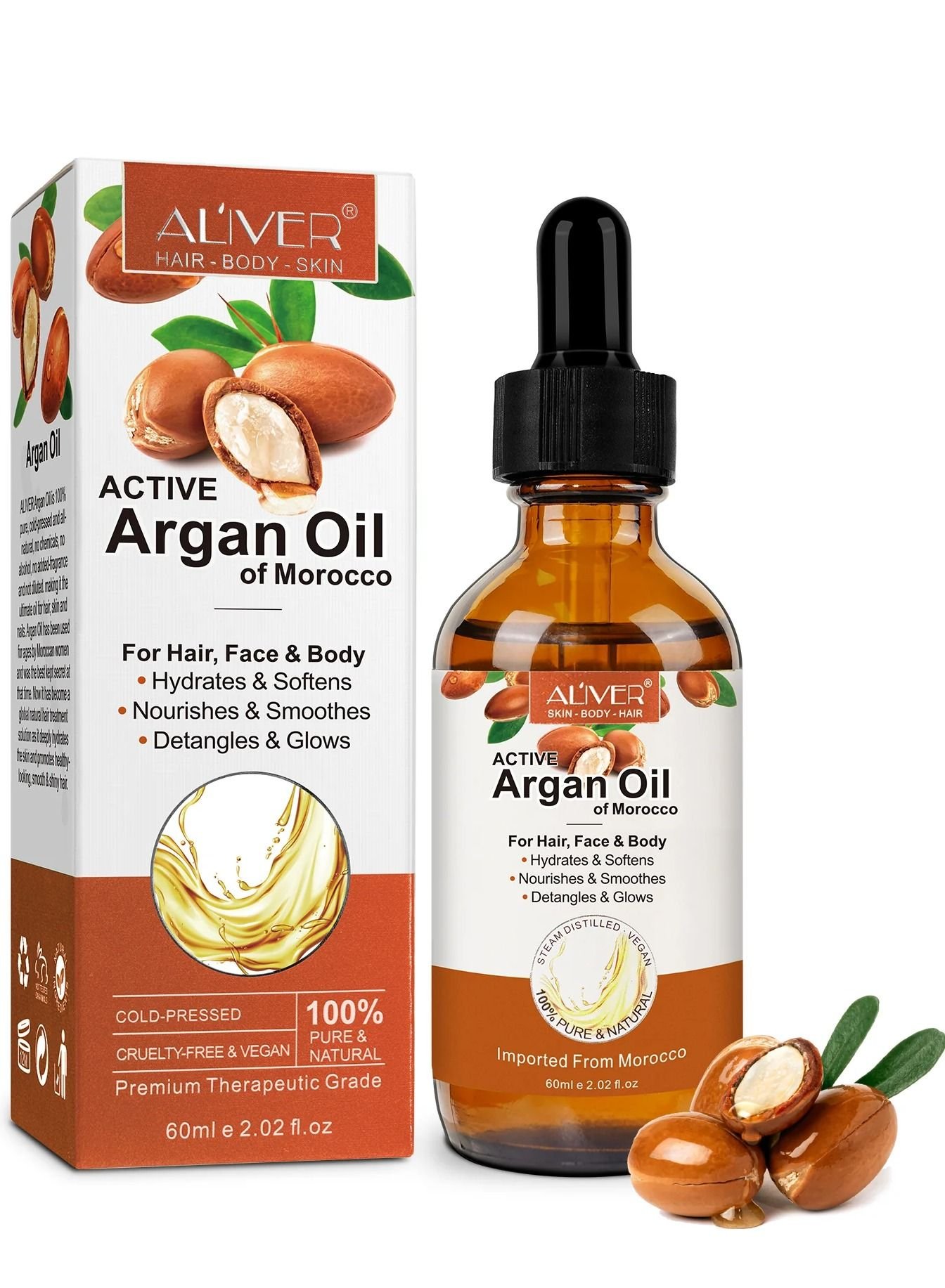 Experience the quality of Aliver with the 60ml Multipurpose Argan Oil for Hair Body Skin Hydrates Softens Smooth and Glows Nourish the Scalp Promote Hair Growth Anti Breakage Loss 100% Pure and Organic Moroccan Argan Oil for Multipurpose Use, now available for express delivery in Bahrain.