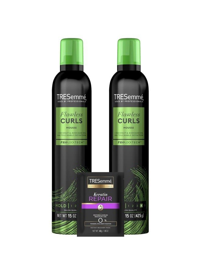 Flawless Curls Mousse 2-Pack + Keratin Repair Hair Mask – Coconut & Avocado Oils, Touchable Hold, Curl Definition, Frizz Control, Color-Safe, Paraben-Free