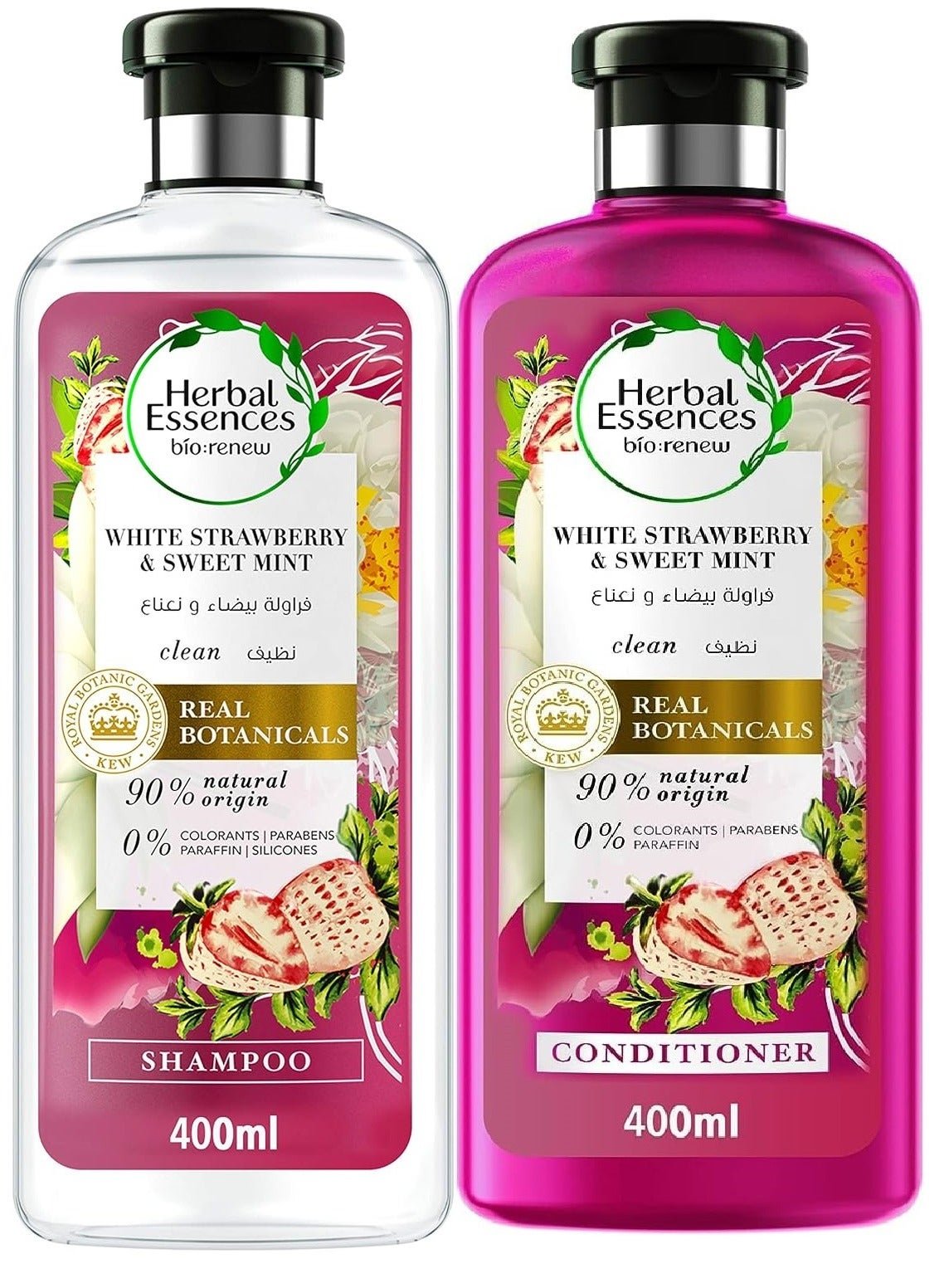 Shop Herbal essences Renew Natural Shampoo and Conditioner with White Strawberry and Sweet Mint for Hair Volume 400ml pack of 2 online in Bahrain. Perfect for anyone looking for premium Shampoos & Conditioners.